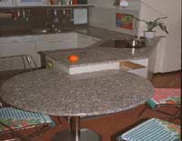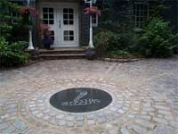 Granitplatte (Durchmesser 1,10 m, ca. 10 cm stark), aus Impala Granit mit Schlangenmotiv (chin. Sternzeichen), eingerahmt von hellem Granitpflaster